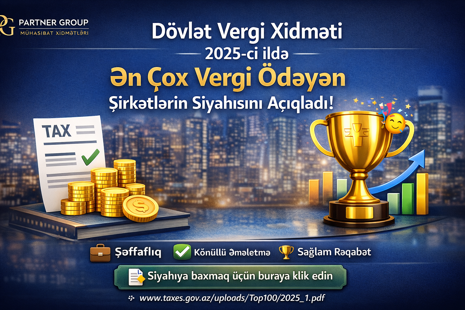 İqtisadiyyat Nazirliyi yanında Dövlət Vergi Xidməti 2025-ci ildə dövlət büdcəsinə ən çox vergi ödəyən və bu məlumatın ictimaiyyətə təqdim edilməsinə razılıq verən vergi ödəyicilərinin, həmçinin 2025-ci il üzrə dolayı vergilər (ƏDV, aksiz) istisna olmaqla hesablaması ən çox olan və bu barədə məlumatın açıqlanmasına razılıq verən 100 vergi ödəyicisinin siyahısını hazırlayıb.