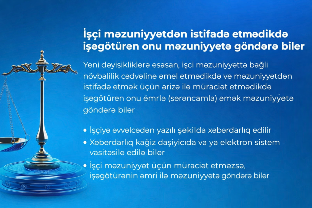 Əmək məzuniyyəti, məzuniyyət növbəlilik cədvəliişəgötürənin səlahiyyəti ilə bağlı son dəyişiklik əmək münasibətlərində mühüm praktik yenilik yaradıb. Yeni qaydaya əsasən, işçi məzuniyyətdən istifadə etmədikdə və bunun üçün müraciət etmədikdə, işəgötürən onu müəyyən prosedura riayət etməklə əmrlə əmək məzuniyyətinə göndərə bilər.